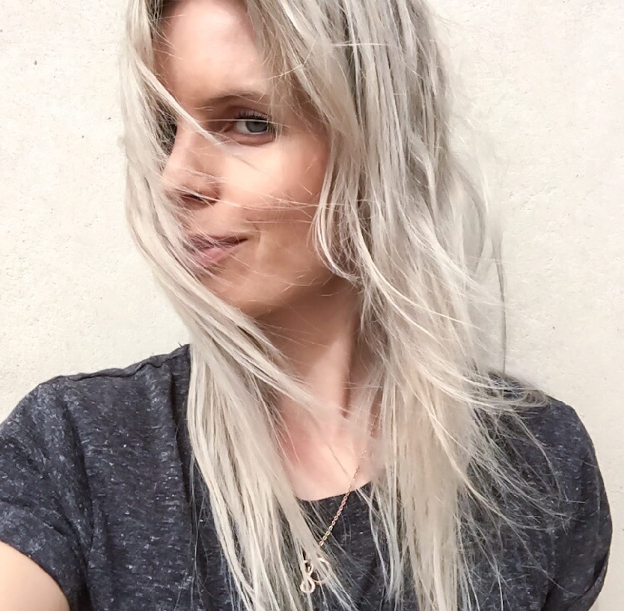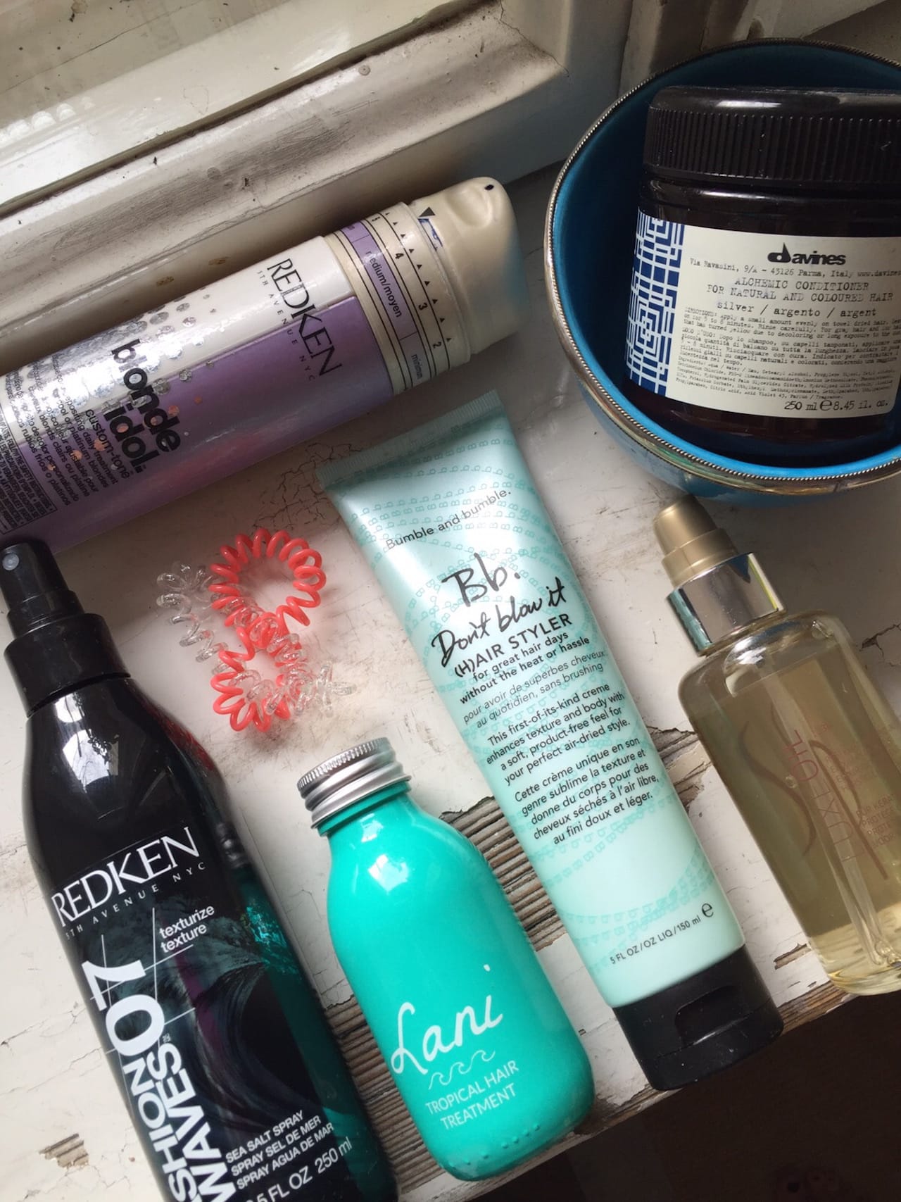 Hallo Lieblingskategorie! Meine Haare tragen seit eh und je die Farbe aschiges Eisbärblond, und das will bei Laune gehalten werden. Alle drei Monate frischt Yasemin von ‚Pracht ist’ in der Münchner Maxvorstadt den Special Ton mit Strähnen und Silbertönung auf, in der Zeit dazwischen ist Tricksen angesagt. Bei Drogerie-Produkten bekommt das Eisbärblond schlechte Laune und wird gelb, denn der Gilb kann sich nicht nur in Vorhänge setzen. Also muss alles her was dunkelviolett schimmert und eigentlich für graues oder weißes Haar geeignet ist. Kollateralschäden an weißen Duschvorhängen werden in Kauf genommen. Shampoos schaffen das Entgilben nur schwer, daher setze ich am liebsten auf dunkelviolette Kuren. Den Härtetest bestanden haben Blonde Idole von Redken (ca. 23 Euro) und der Alchemic Conditioner Silver von Davines (ca. 25 Euro), bei beiden genügen 1-2 Anwendungen um wieder in coolem Silber zu schimmern. Was das Styling betrifft mag ich es entspannt. Ich bin kein Föhn-Fan, nutze ihn meist nur um meinen Pony in Schwung zu bringen. Wenn ich abends dusche, gehe ich mit feuchten Haaren und einem Klecks Bb Don’t Blow (H)air Styler von Bumble and Bumble (ca. 30 Euro) in den Längen ins Bett. Das verhindert den Wischmopp am Morgen und setzt sich gegen hartnäckige Wirbel durch.