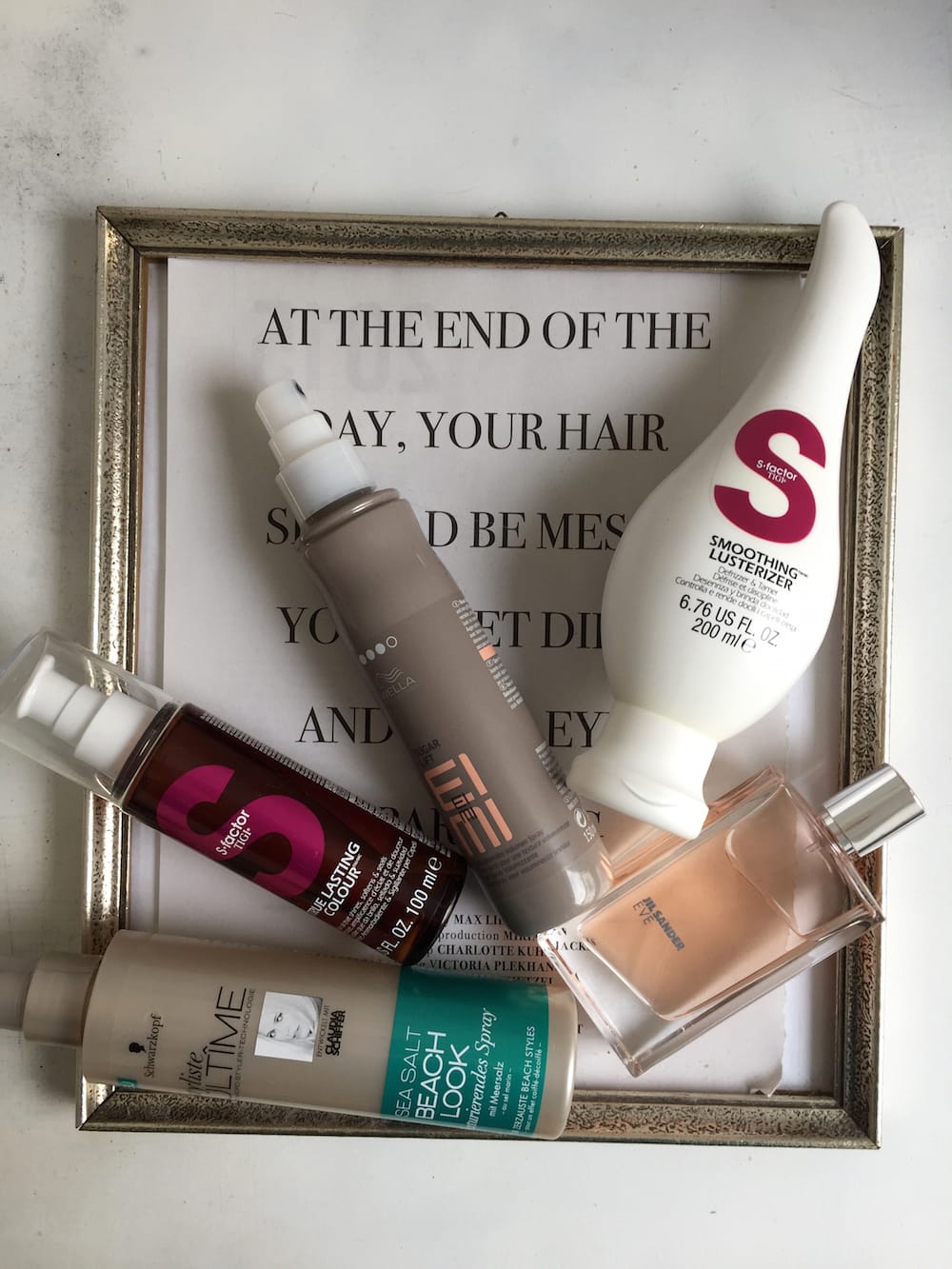 Ich wasche meine Haare in Rotation mit dem Shampoo von S-Factor by Tigi (ca. 24 €), dem Toni & Guy Weightless Volume Conditioner (ca. 9 €) und der neuen Pflegeserie Regenerierende Aufbaupflege von Dove (ca. 4 €). Niemals ohne Conditioner und 1x die Woche mit Haarkur. Nach dem Waschen knete ich den Spitzenfluid von S-Factor by Tigi True Lasting Color (ca. 16 €) ins handtuchtrockene Haar und streiche den Smoothing Lusterizer (ca. 16 €) in die Längen.