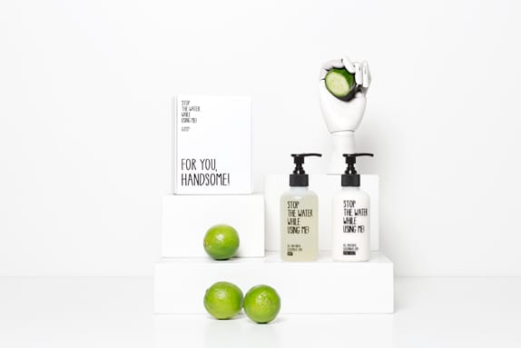 STOP THE WATER WHILE USING ME! ist die Naturkosmetik-Serie mit klarem ökologischen Appell zum Wassersparen. Das stark reduzierte Verpackungsdesign ruft auf sympathische und lässige Art in Erinnerung, wie leicht es sein kann, sich im Alltag umweltbewusst zu verhalten. Die komplette Pflegeserie aus Shampoos, Cremes, Seifen, Duschgels uvm. besteht zu 100% aus natürlichen Inhaltsstoffen, wird ohne synthetische Duft-, Farb- und Konservierungsstoffe hergestellt, ent- hält keine Silikone, Paraffine oder andere Rohstoffe auf Mineralöl-Basis und ist vollständig biolo- gisch abbaubar.