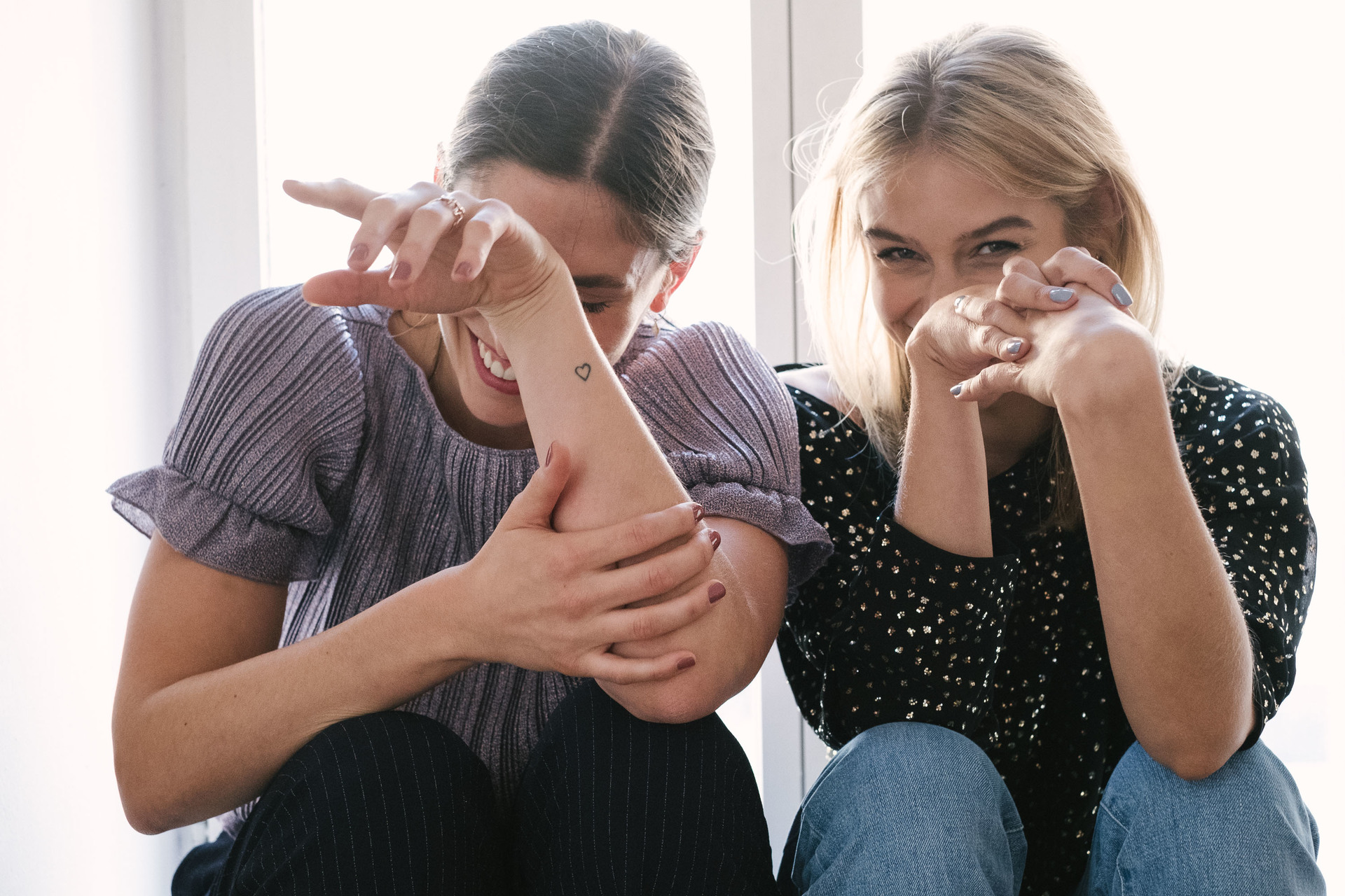 Zu Guter letzt durften noch ‚Brick‚, ein schöner Backstein-Ton, und ‚Cloud 9′, ein helles Himmelblau, auf unseren Nägeln Platz nehmen. Dazu habe ich mir mein Glitzer-Party-Top (von H&M Trend) übergezogen, Sarah trägt ein Funkel-Shirt von &Other Stories und Jeans. Passt alles ziemlich gut, finde ich. Nicht zu angestrengt, aber dennoch irgendwie cool. Und mit den Farben auf den Nägeln ein gelungene Combo.