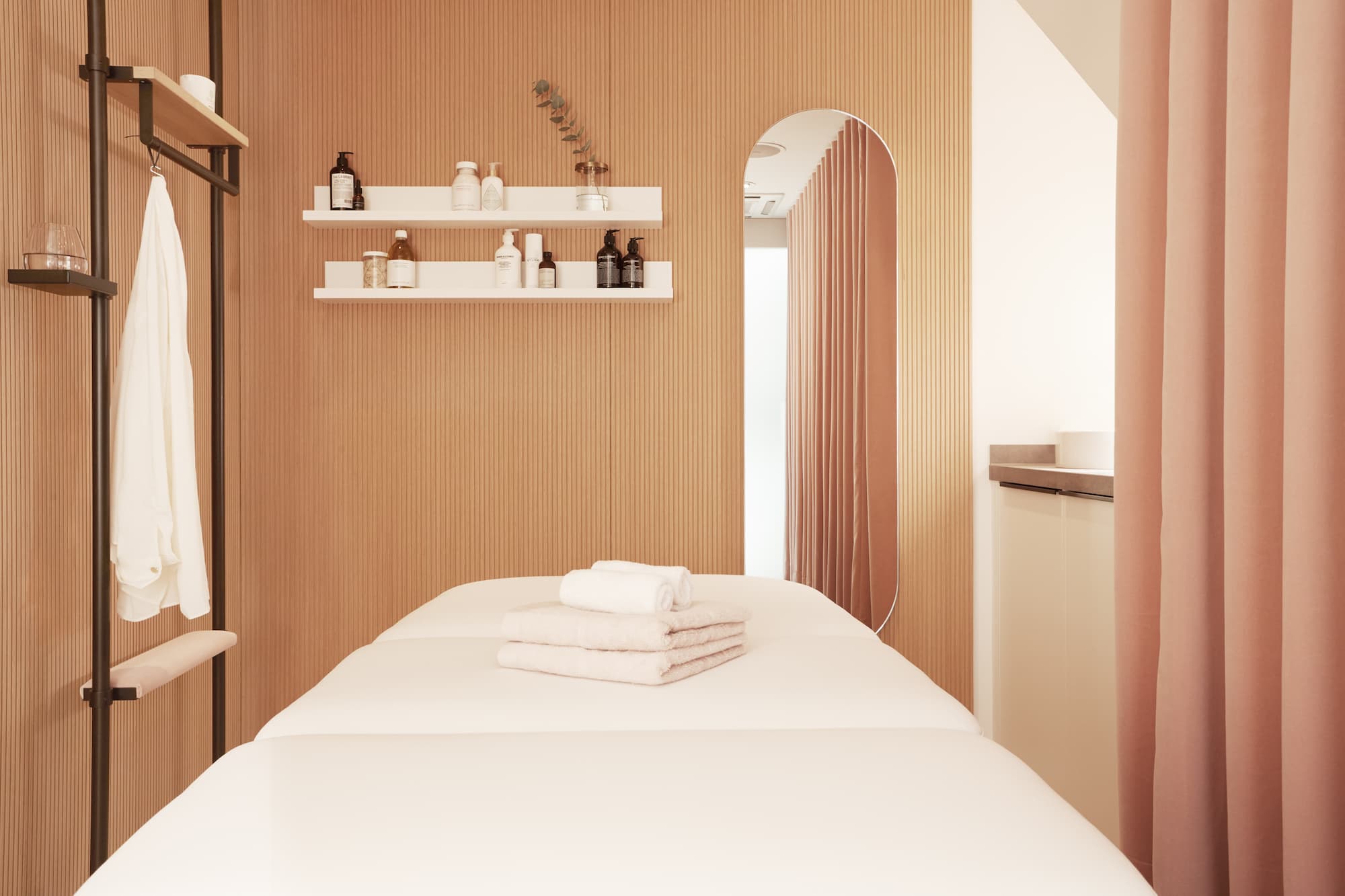 Optisch spiegelt der Douglas PRO Store die moderne und zeitgemäße Ausrichtung des neuen Beauty-Konzepts wider: Das Konzept vereint „Hygge“-Elemente, die für Gemütlichkeit sorgen, mit reduzierter Designsprache und greift aktuelle Standards auf. Warme Naturmaterialien wie Seekiefer treffen auf hochwertiges Messing und weiche Samtstoffe in elegantem Grau. Die zurückhaltende Innenarchitektur verspricht Ruhe und Wohlbefinden und der Look des Stores wirkt wohltuend auf alle Sinne.