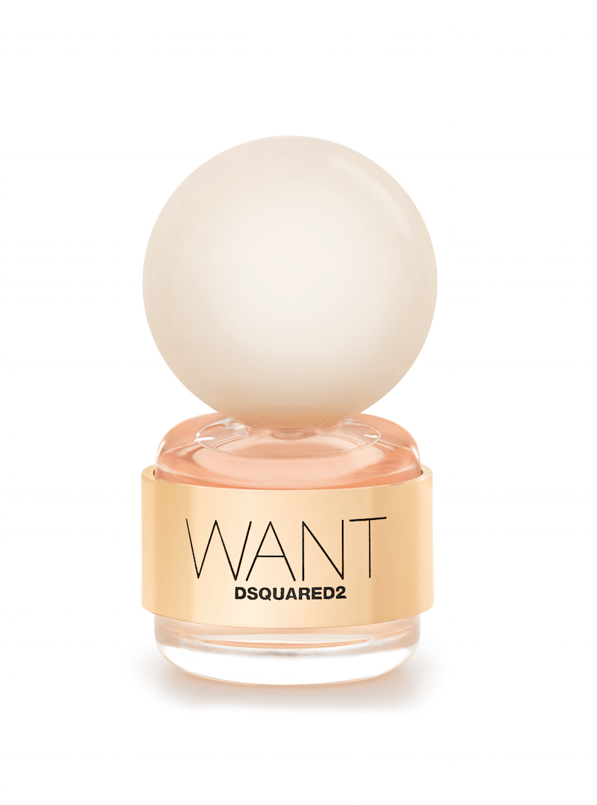 Die runde, elegante Glasflasche balanciert die glatte, elfenbeinfarbene Kugel, die als Verschlusskappe dient. Eine goldene Plakette umhüllt den Glasflakon und trägt mit der Gravur “WANT DSQUARED2” elegant und entschlossen die Botschaft des Konzepts. Die passende, cremefarbene Umverpackung hat eine goldene Vorderseite, die ebenfalls durch das elegante WANT Logo in zierlicher aber ausdrucksstarker Schrift geziert wird.
