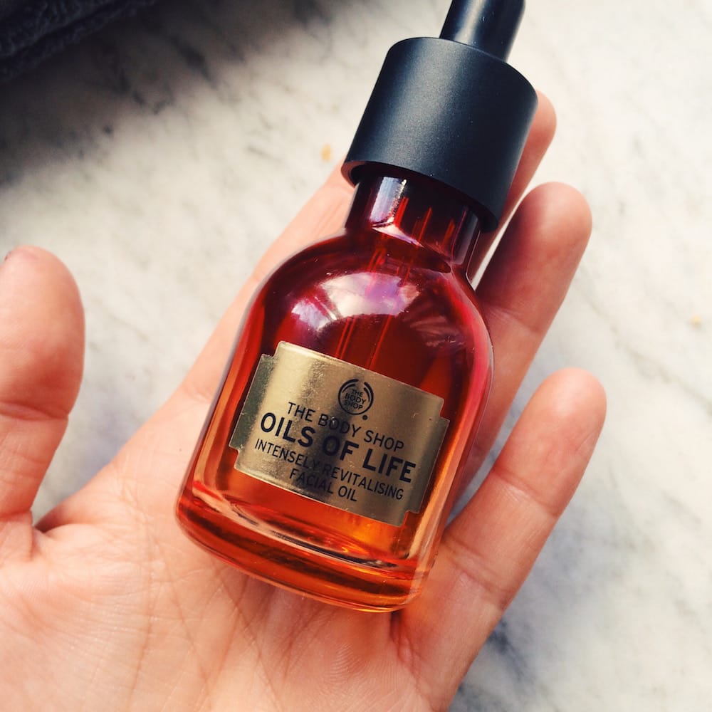 Neben meinem absoluten Favorit von Kiehl‘s und eigens gemischten Ölen probiere ich immer gerne auch mal etwas Neues aus. Zur Zeit benutze ich das Intensely Revitalising Facial Oil von The Body Shop (ca. 32€) aus der neuen Oils of Life – Kollektion. Es duftet nach ätherischen Ölen, aber dezent und ist daher als tägliche Pflege super angenehm. Auch die Dosierung ist durch die Pipette sehr gut möglich. Ich tupfe ein paar Tropfen auf meine Fingerspitzen und fange dann an das Öl einzumassieren. Es zieht schnell ein und das auch spürbar. Die Mischung machts. Kaltgepresste Öle aus 99% natürlichen Ursprungs, wie Schwarzkümmelsamenöl, Kameliensamenöl und Hagebuttensamenöl, sorgen für Hautstraffung und wertvolle Nahrung für die Haut. Bis ich mein Outfit rausgesucht habe ist das Öl schon eingezogen und meine Haut fühlt sich frisch und weich an, ohne zu kleben.