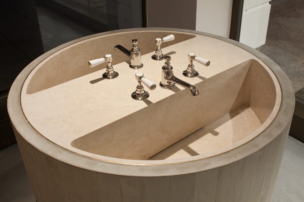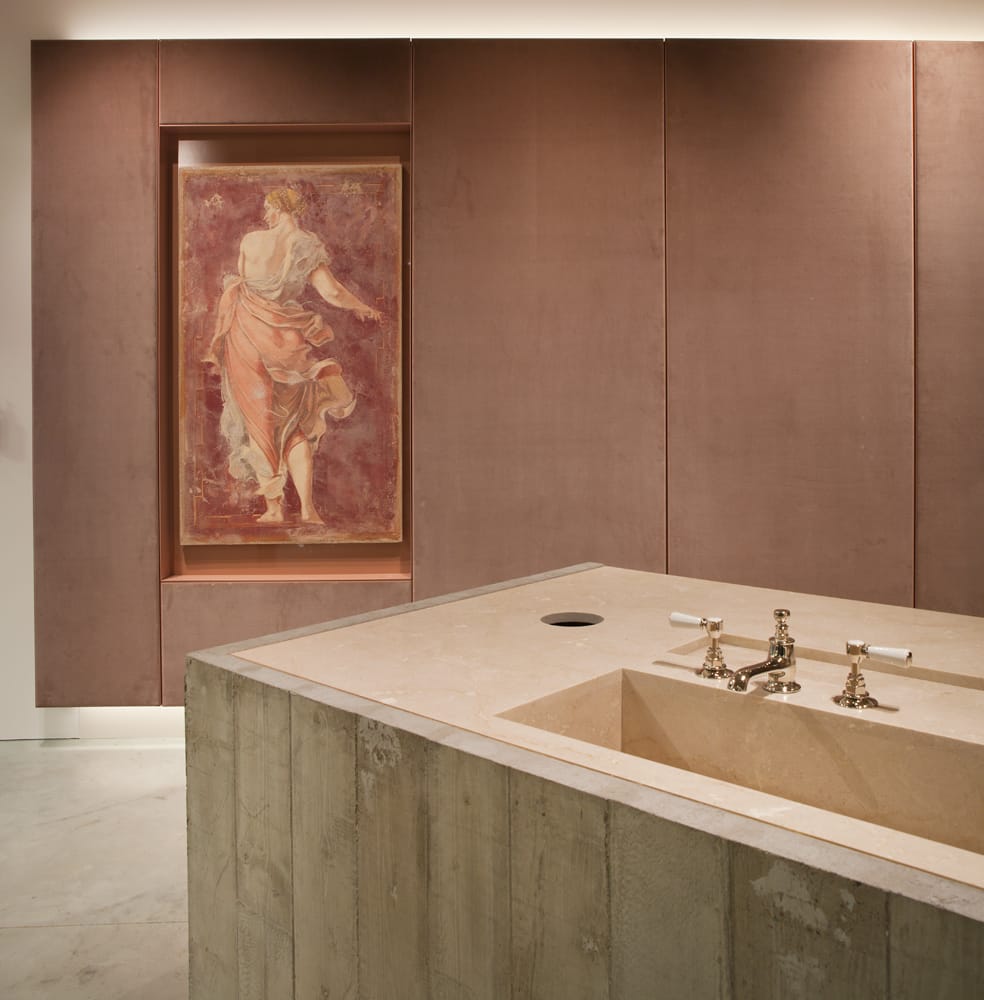 Das Design der zusammen mit einszu33 mitten im historischen Einkaufszentrum Luitpoldblock entwickelten Räume experimentiert mit Ausgewogenheit und Spannung, hervorgerufen durch starke Kontraste in Materialität und Struktur sowie feine haptische Akzente. Ein überdimensionaler, zentraler Ladentisch aus Beton komplettiert die abgestufte Betondecke und die Estrichfußböden. Diese Elemente des Brutalismus fügen sich in die Architektur der Nachbarschaft ein. Im Kontrast zur monolithischen Strenge der Ladentheke verleiht Carrara-Marmor als Auflage und eingelassenes Waschbecken eine sanftere Atmosphäre. Ein Betonwaschbecken im Nebenraum ermöglicht ausgiebige Beratungen, die antike Möblierung lädt zum Verweilen.
