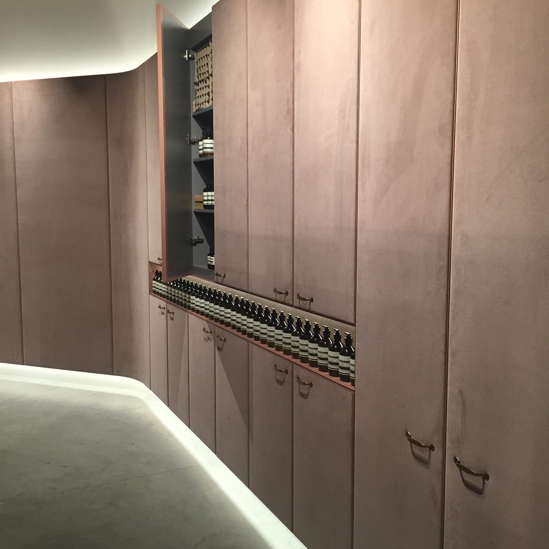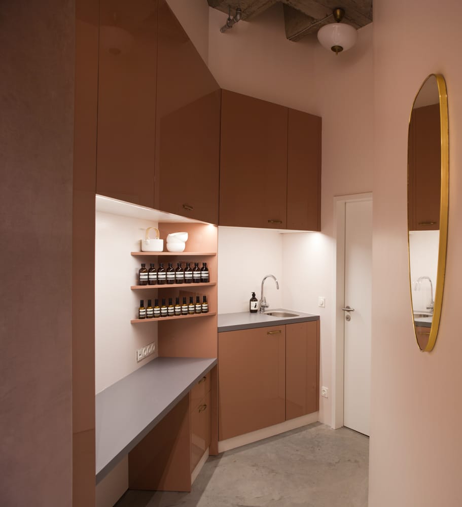 Vertikale Trapeze aus Altmessing mit schmalen Regalen aus Carrara-Marmor hängen von der Decke herab und befinden sich vor dem Fenster. Die gegenüberliegende Wand ist mit schimmernden Samtpanelen verkleidet, die das Licht im Tagesverlauf immer wieder anders reflektieren. Besucher können die hochwertigen Haut-, Haar- und Körperpflegeprodukte aus pflanzlichen und im Labor gewonnenen Inhaltsstoffen entdecken und erstehen. Die im Store tätigen Consultants finden in persönlicher Beratung die für den individuellen Bedarf am besten geeigneten Produkte.