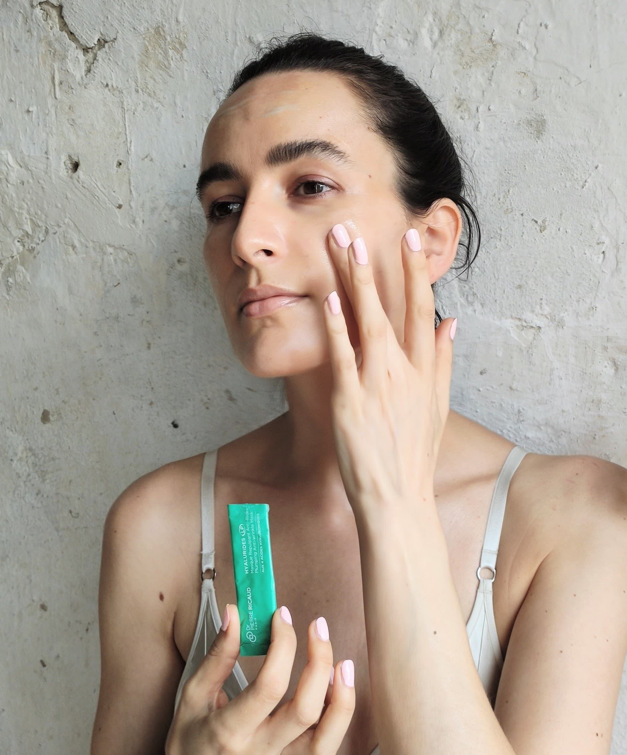 Eine Hyaluronsäure mit hohem Molekulargewicht bildet einen auffüllenden Film auf der Haut. Eine zweite Säure wirkt in der Epidermis, also der äußeren Hautschicht. Eine dritte Säure wirkt in der Dermis, auch Lederhaut genannt und die mittlere Hautschicht der insgesamt drei Hautschichten. Und last but not least enthalten die Produkte eine verkapselte Hyaluronsäure mit Langzeitfreisetzung, die über den Tag verteilt ihre Wirkung entfaltet.