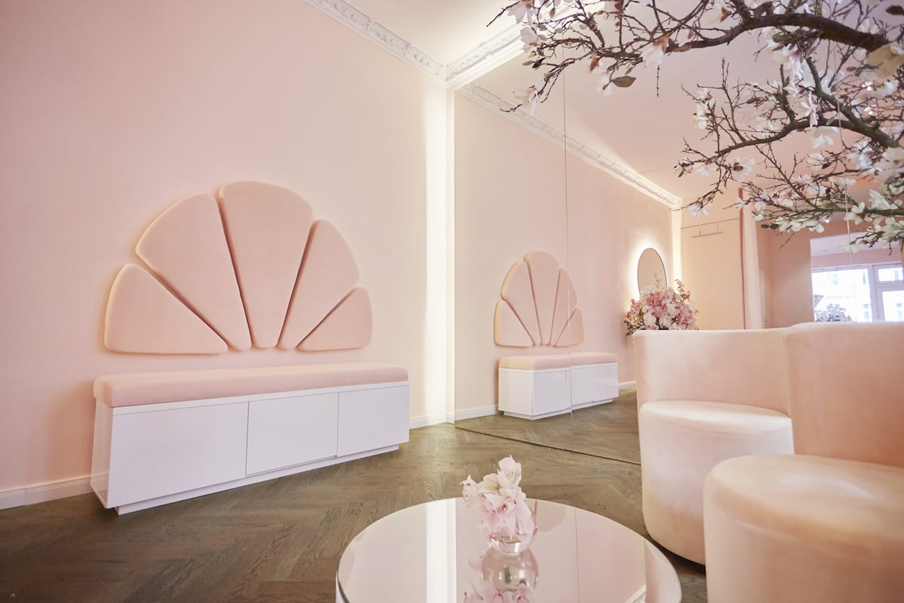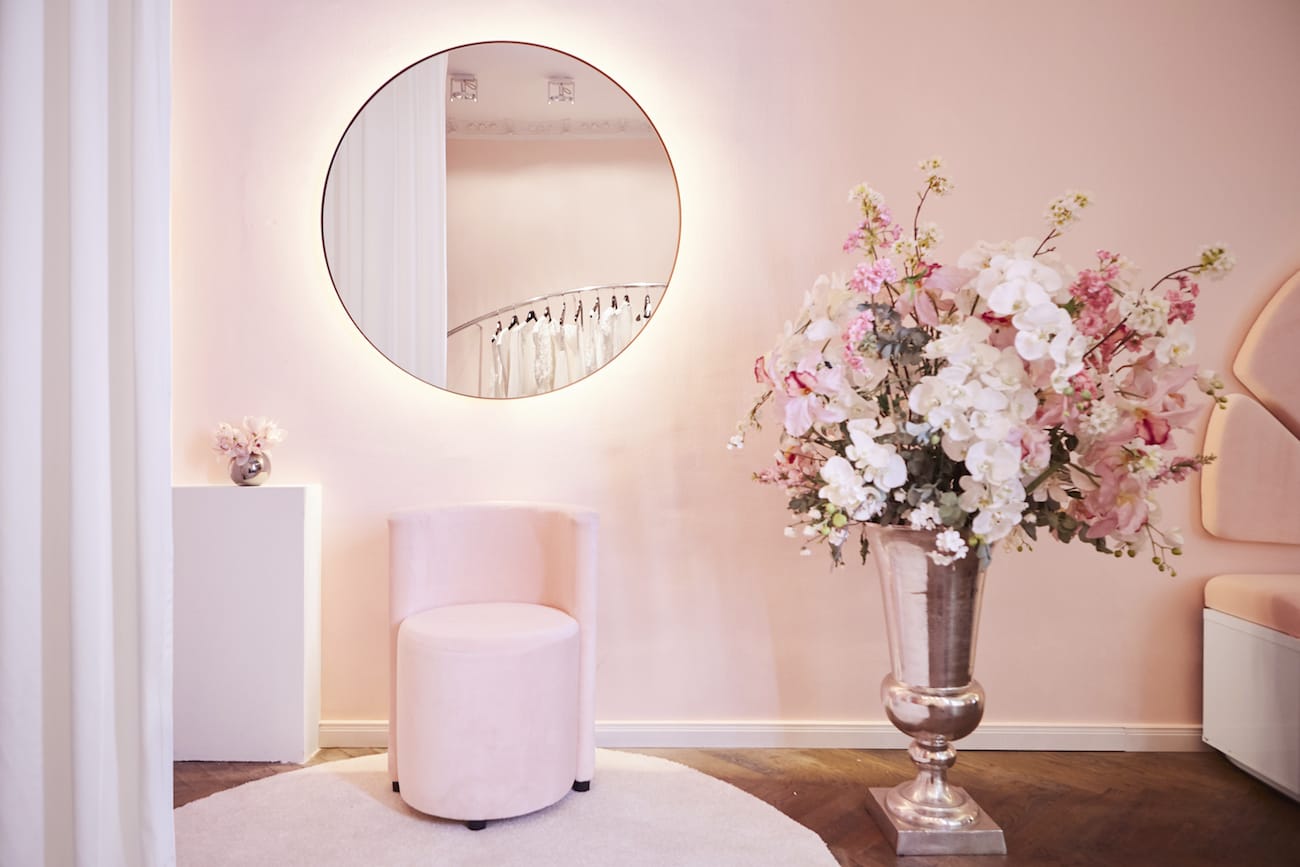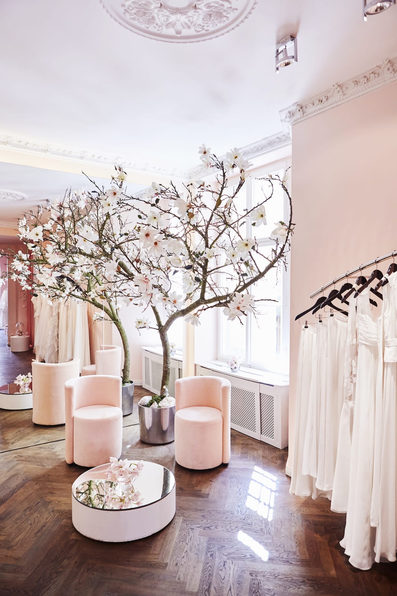 Rosé farbene Wände, elaborierte Stuckdetails mit Engelsmotiven, organisch geschwungene Formen und florale Elemente spiegeln den zarten, femininen Look von Kaviar Gauche wider und hüllen das Bridal-Paradies in eine pudrige Wolke. Herzstück der Bridal Budget Boutique ist ein ewig blühender Magnolienbaum, der ganzjährig eine frühlingshafte Atmosphäre für die entspannte Brautkleid Suche schafft und gleichzeitig als ästhetisches Highlight die Boutique schmückt.