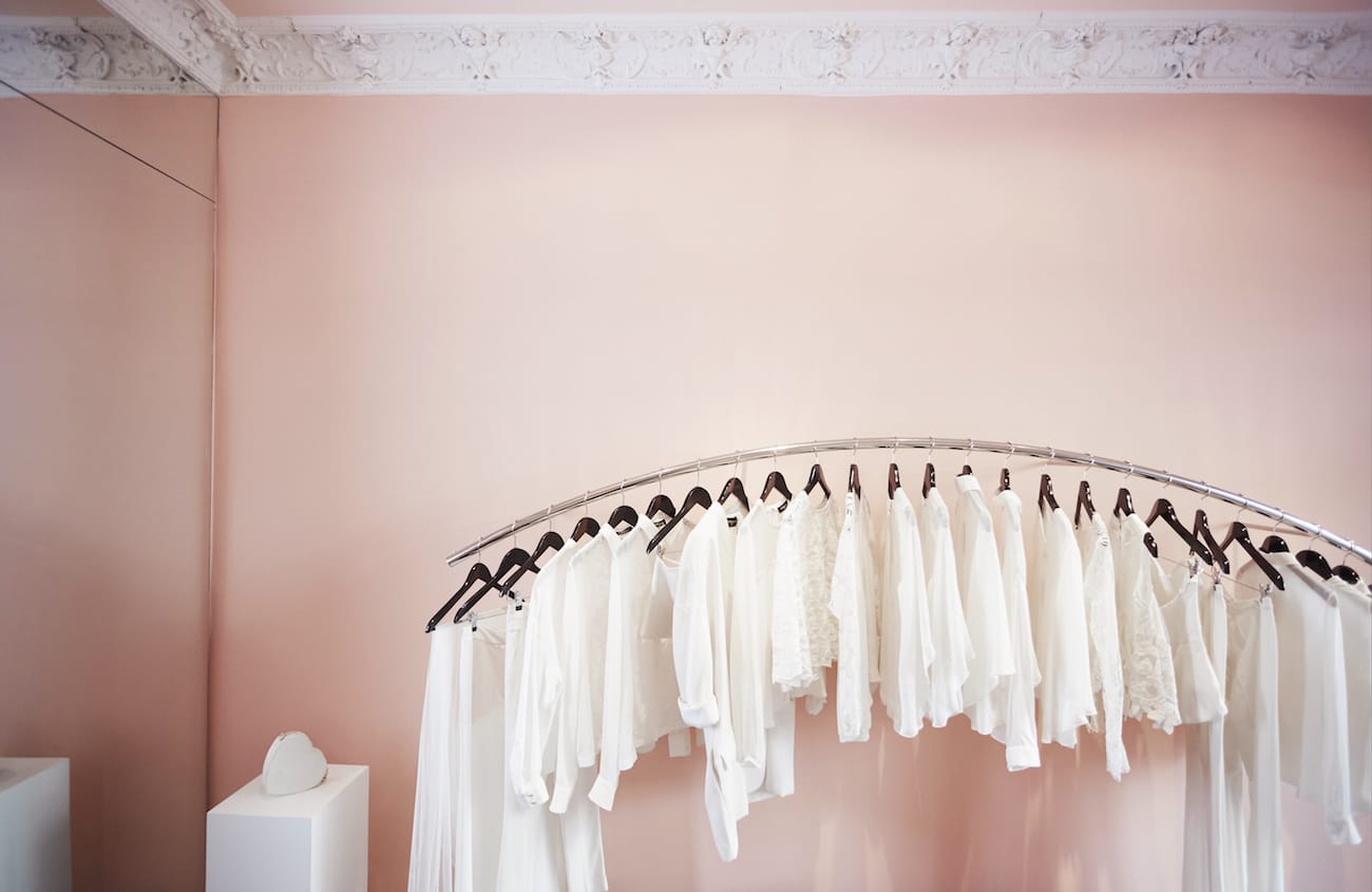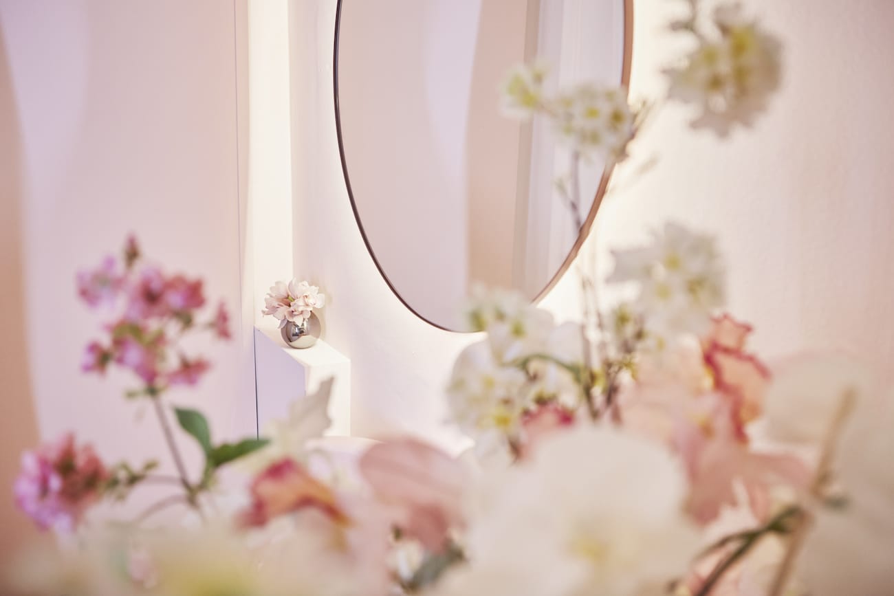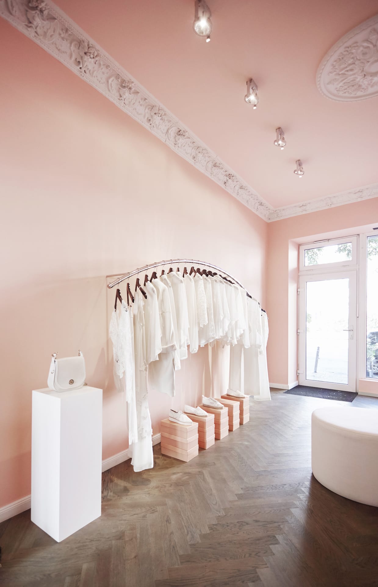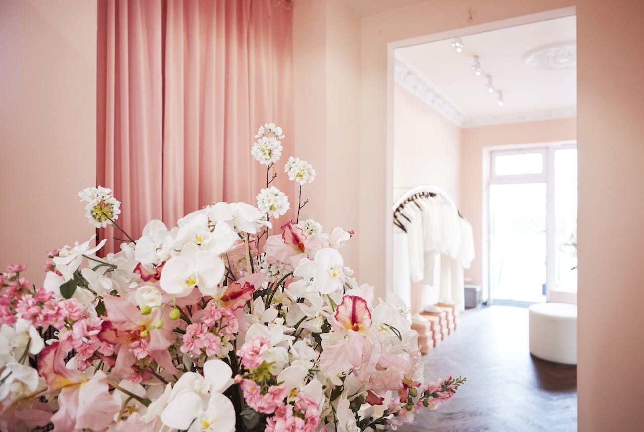 Rosé farbene Wände, elaborierte Stuckdetails mit Engelsmotiven, organisch geschwungene Formen und florale Elemente spiegeln den zarten, femininen Look von Kaviar Gauche wider und hüllen das Bridal-Paradies in eine pudrige Wolke. Herzstück der Bridal Budget Boutique ist ein ewig blühender Magnolienbaum, der ganzjährig eine frühlingshafte Atmosphäre für die entspannte Brautkleid Suche schafft und gleichzeitig als ästhetisches Highlight die Boutique schmückt.