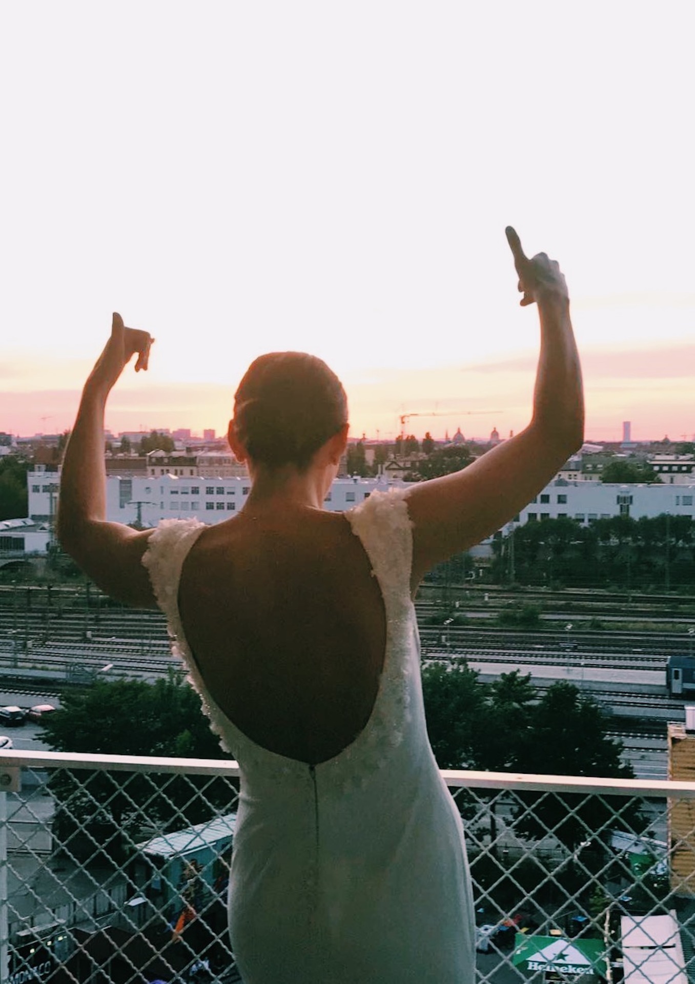 Nach der Trauung folgten die obligatorischen Glückwünsche, Drinks, Snacks und natürlich das Brautstraußwerfen. Zum 3 Gänge Dinner ging es dann nach innen. Während des Dinners verschwand die Sommersonne hinter unserem Tisch und der Münchner Skyline und färbte den Himmel Rot-Orange. Ich sag’s euch: fertig mit den Nerven ist man da. Wie umwerfend kann es denn bitte noch werden?