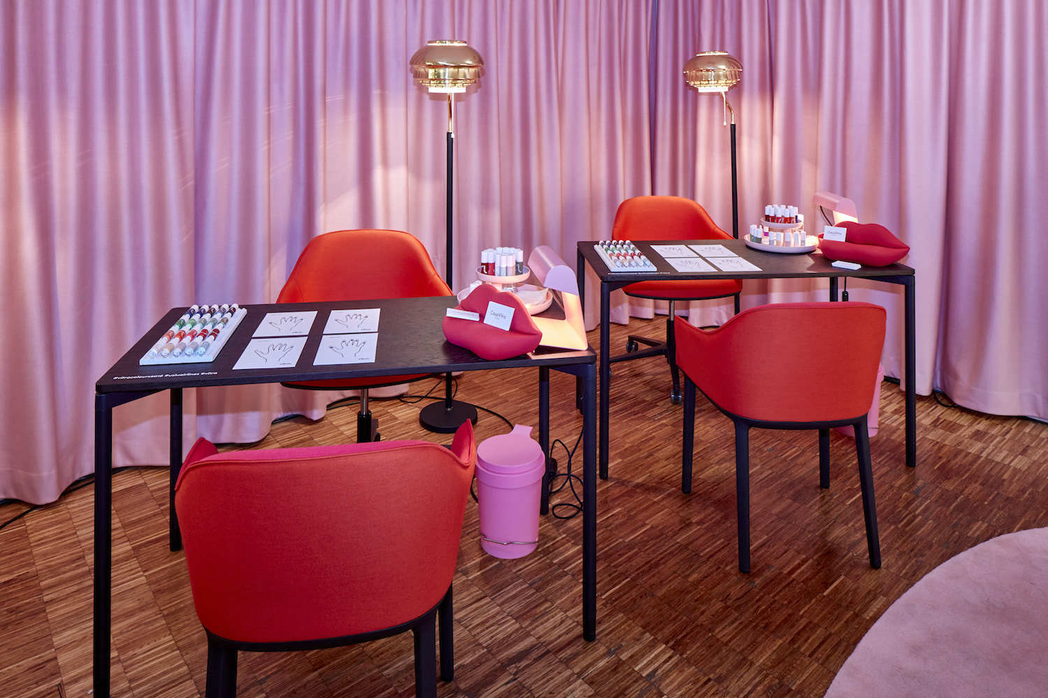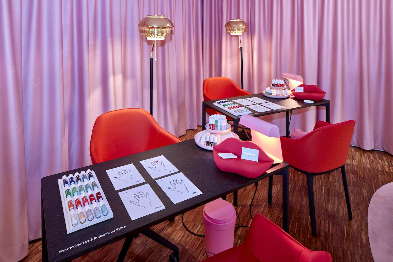 In der CasaVitra, nicht weit vom Mailänder Corso Como, wird die Rauminstallation „Colour Machine“ gezeigt. Die Installation widmet sich der Farb- und Textilkollektion von Vitra und präsentiert Erkenntnisse und Inspirationen von Chefdesignerin Hella Jongerius. Und genau hier kommt Uslu ins Spiel. Im COLOUR SPA der CasaVitra haben die Besucher die Möglichkeit sich mit neuen Farben die Nägel lackieren zu lassen.