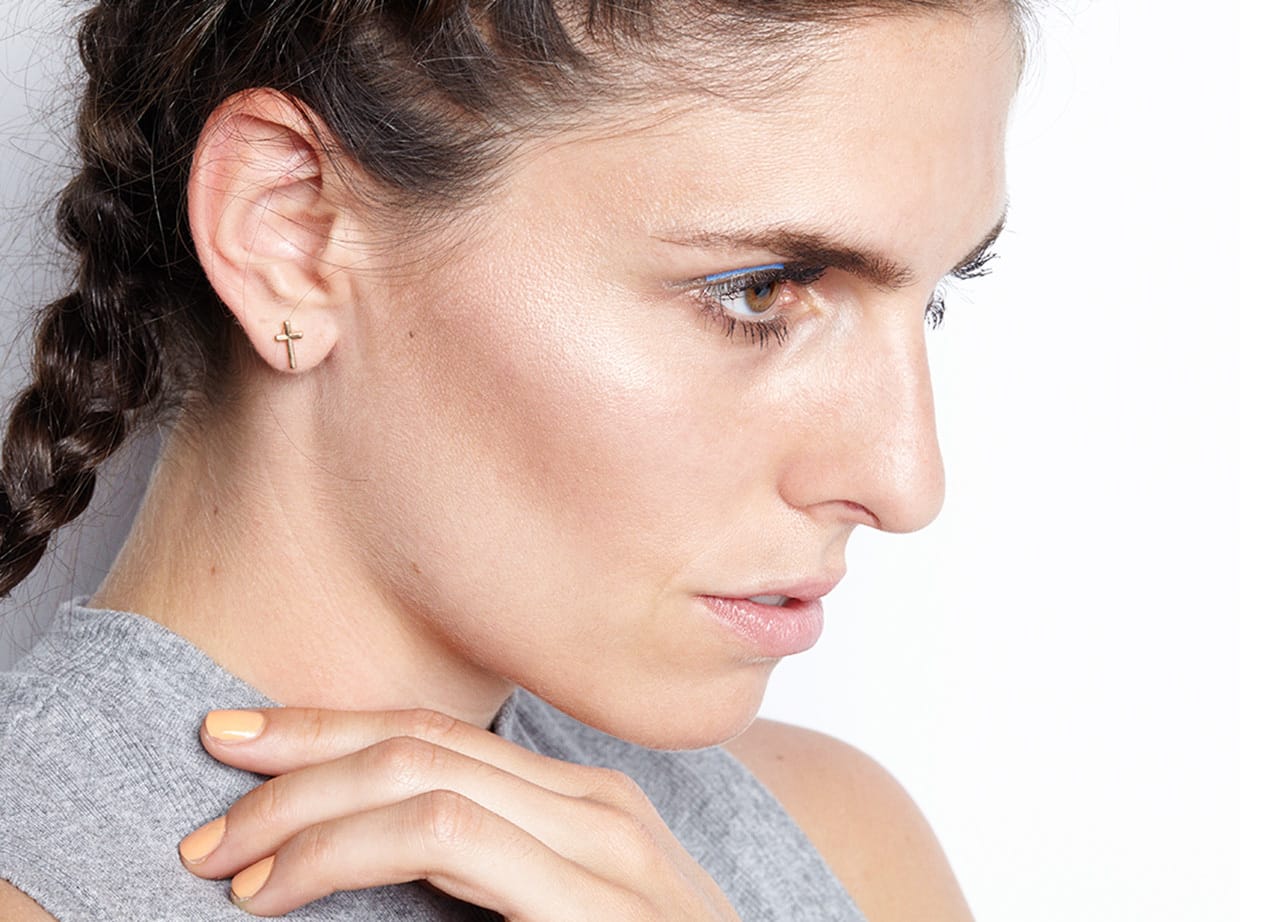 Blau, Grau und Orange harmonieren immer. Also Orange auf die Nägel und einen regulären, schwarzen Lidstrich gegen ein knallig blaues Stoffquadrat ausgetauscht. Darunter habe ich leicht schimmernden Metallic-Lidschatten in hellgrau aufgetragen, so wirkt das Blau nicht allzu hart. Auf die Lippen kommt ein zarter Nude-Ton, der die Lippenfarbe etwas reduziert. So knallen Blau und Orange besonders schön! Befestigt werden alle Stoffstücke übrigens mit dem Wimpernkleber „Duo“ (ca. 7 €), mit dessen praktischen Pinsel-Applikator das Aufkleben zum Kinderspiel wird. Wichtig ist nur, dass der Kleber auf einem trockenen Lid appliziert wird und nicht auf dem Stoff direkt, da sich der Kleber sonst durch den Stoff drückt und teilweise sichtbar wird. Genauigkeit ist hier auch nicht zu 100 % gefragt, da der Kleber nach dem Austrocknen durchsichtig wird. Perfekt also für alle, die sich mit normalem Eyeliner auch schwer tun.