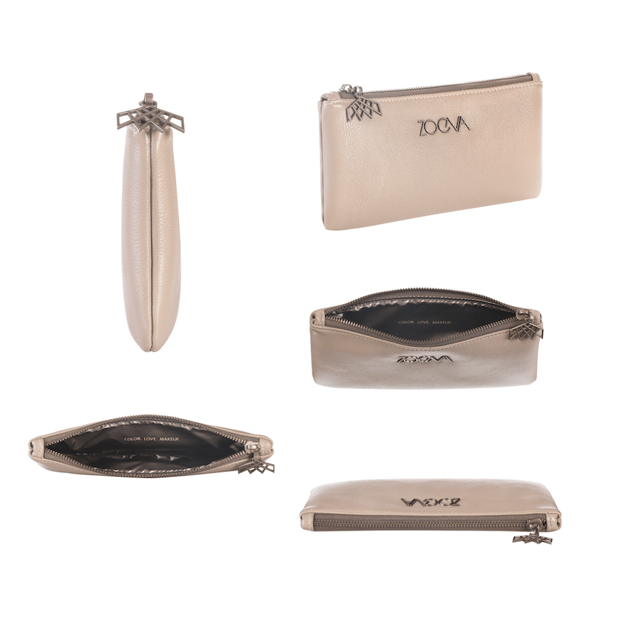 Die dazugehörige, taupefarbene Clutch hat einen markanten, kronenförmigen Metall-Reißverschluss und ist mit seinem futuristischen Innenfutter