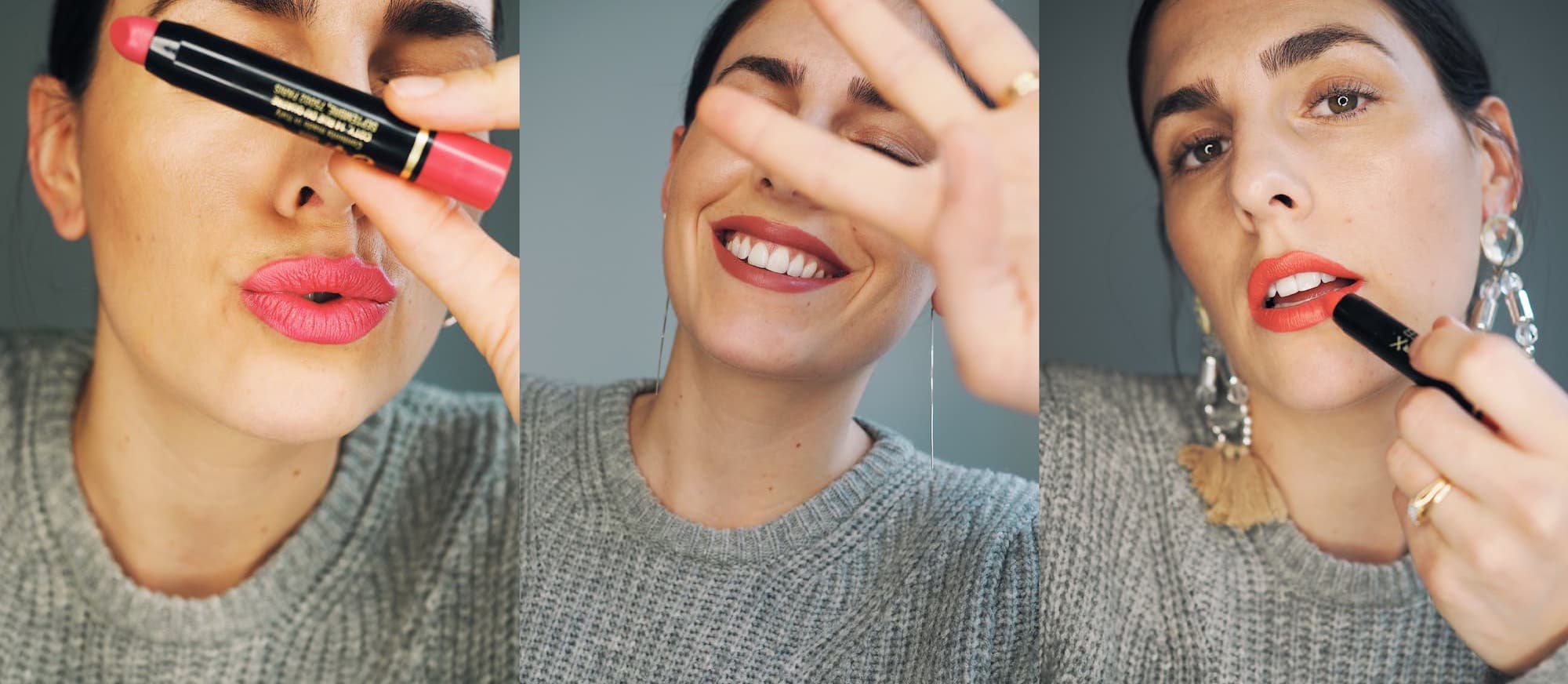 Eine ganz andere Farbwelt deckt ‚Matte Perfect Plum‘ ab. Nummero Due aus dem ‚Colour Elixir Lip Butter‘ Sortiment hüllt die Lippen in ein sattes, kräftiges Pflaumen-Lila, das allein getragen zum wahren Statement Piece eures Looks wird. Ich habe übrigens bewusst auf Mascara, Lidschatten & Co. verzichtet, damit ihr in den vollen Genuss der Töne von Max Factor kommt und besser sichtbar ist, wie sie alleine wirken. ‚Perfect Plum‘ war beim Ausprobieren übrigens meine persönliche Überraschung, denn ich trage – wie ihr vielleicht wisst – nicht allzu oft lilafarbene Lippenstifte. Dieser hier hat mich aber wirklich positiv überrascht, denn er passt mega gut zu meinem grauen Jumper und hat sich dann dank Wattestäbchen-Technik auch noch als die perfekte Farbe für einen Undone-Look herauskristallisiert. Hierfür tragt ihr den Lippenstift wie gewohnt auf die Lippen auf und rollt anschließend mit einem Wattestäbchen über die Lippenränder. So verblendet sich die Farbe dezent mit den Lippenkonturen und die Watte reduziert gleichzeitig die Farbe, was einen ‚ausgefransten‘ lived-in Look kreiert. Oft sind mir Farben mit mattem Finish einfach zu ‚in-your-face‘ beziehungsweise zu hart, dann greife ich immer auf ein Q-Tip zurück – der Trick für #redwinelips klappt immer und sieht einfach lässiger aus!