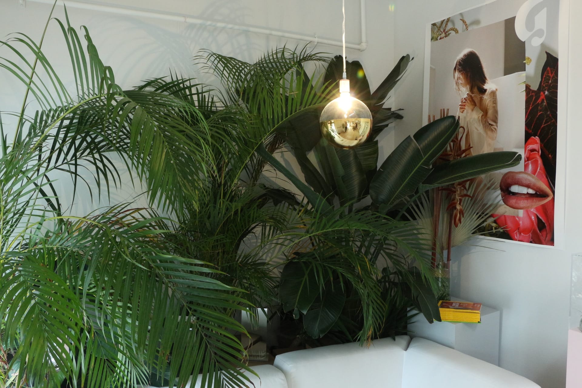 Im vierten Stock angekommen, öffnen sich die Aufzugstüren und man tritt direkt in den Store. Rechts sitzen Annie vom Team plus zwei Assistenten, die direkt auf einen zustürmen und einem das Konzept erklären. Alles kann getestet werden, wer müde ist kann sich auf der kleinen Couch unter Palmen ausruhen und wer Lust hat, begibt sich einen Raum samt Installation einer Künstlerin (deren Namen ich vergessen habe). Also rein in die Installation, man will ja nicht unhöflich sein. Schuhe aus, rein in die Kammer, die komplett mit Alufolie tapeziert ist. Die Tür geht zu, melancholische Musik geht an und ein Farbprojektor sprinkelt die buntesten Farben an die Wände. Alles funkelt, glitzert und ich frage mich: wat is hier los?