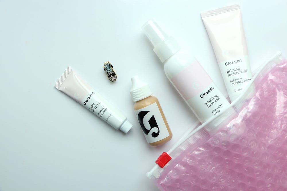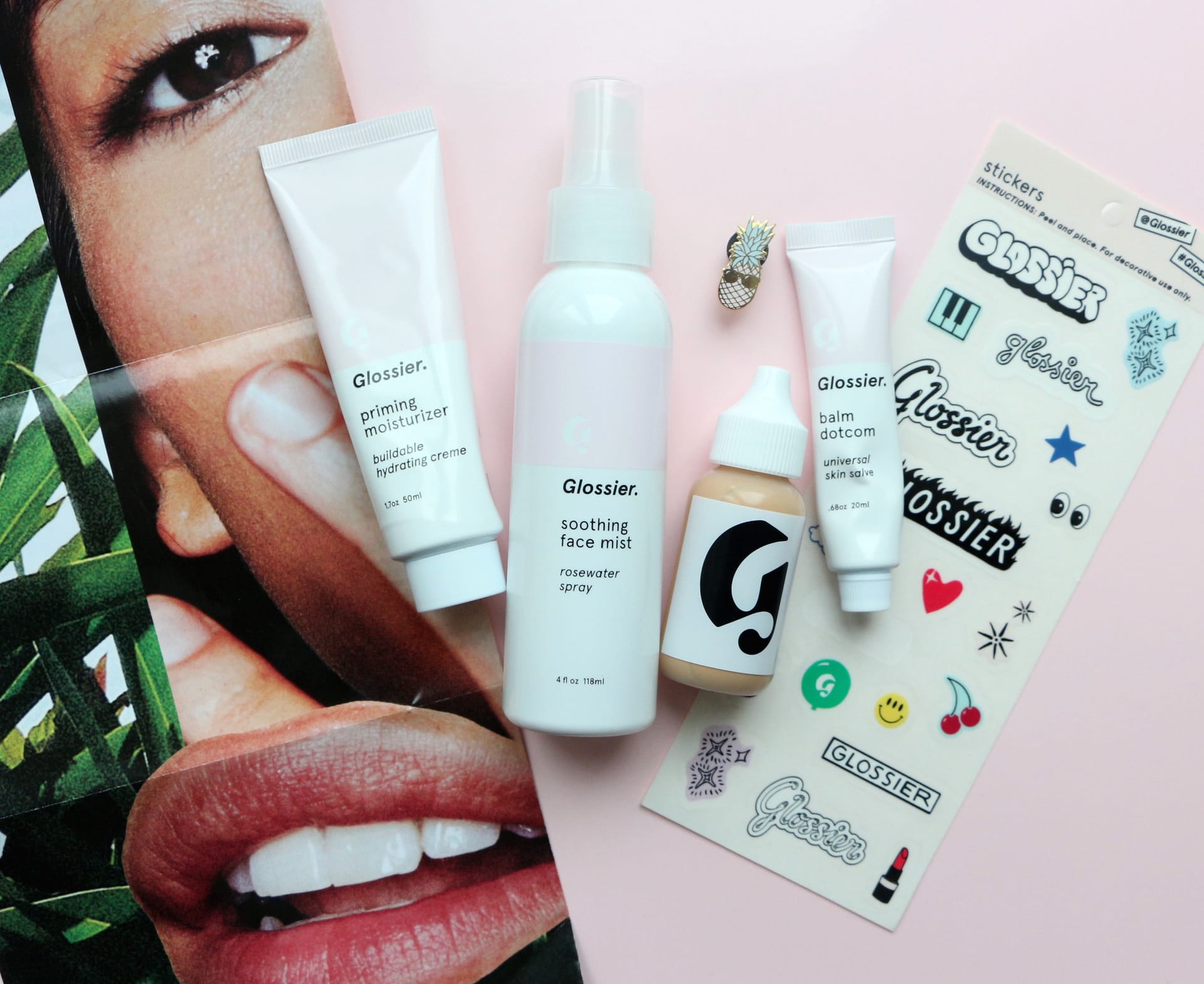 Gut, zurück zu meinem Shoppingprozess. Ich entscheide, für mich einmal die Glossier Phase 1 Set zu kaufen. In der weißen Box sind je ein Exemplar aller bisher lancierten Produkte plus eine kleine Ananas-Anstecknadel mit Sonnenbrille, ein Poster, Emoji-Sticker zum Verschönern der Produkte und ein Glossier-Sticker. So pretty und so cool! Noch heute denk ich mir: Ich wills am liebsten gar nicht anbrechen, sondern für die nächsten Monate nur aufstellen und anschauen…