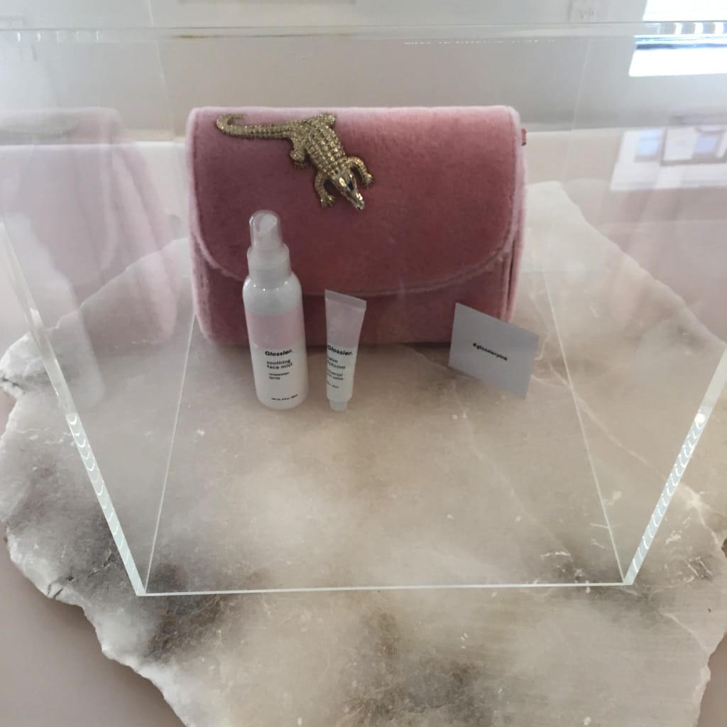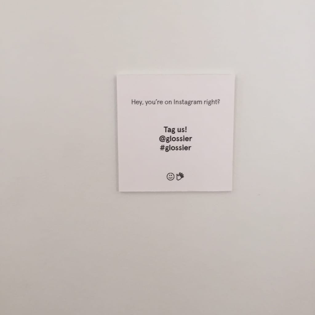Schon außen prangen fett ein Glossier Banner plus Aufsteller, vor dem Lift kündigt sich schon die Hausbesetzung der Beautyverrückten an: auf zwei von vier Stockwerken sitzen die coolsten Beautyuschis. Während ich also auf den Lift warte, merke ich wie die Aufregung steigt. Wie vor einer Klausur. Gott, bin ich wirklich so ein Groupie?, frage ich mich. Im Spiegel im Aufzug werden nochmal Haare und Gesicht gecheckt.