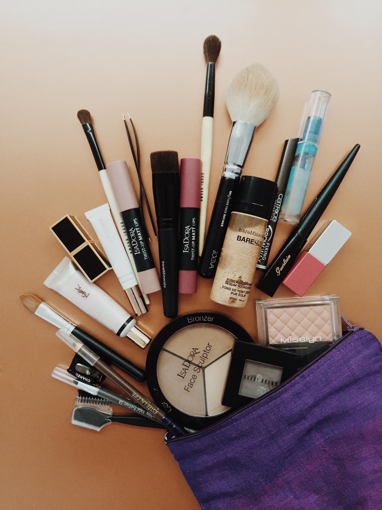 TEINT. Auch hier gilt: bitte nur das nötigste. Eine fast leere Foundation, die man ohne Tränen in den Augen zurücklassen kann, sollte sie auslaufen oder zerbrechen. Mein fast leeres Model der Bare Skin Serum Foundation von Bare Minerals ist perfekt dafür. In meinen Augen ist das übrigens die betse Foundation – ever. Für den perfekten Urlaubsglow sorgt neben der Sonne noch der flüssige Dare to Glow von Yves Saint Laurent, während der Face Sculptor von Isadora mir die Bräune vortäuschen kann bis ich wirklich knackig braun bin. Und für die Apfelbäckchen habe ich einen Misslyn Compact Blush eingpackt. That’s it.