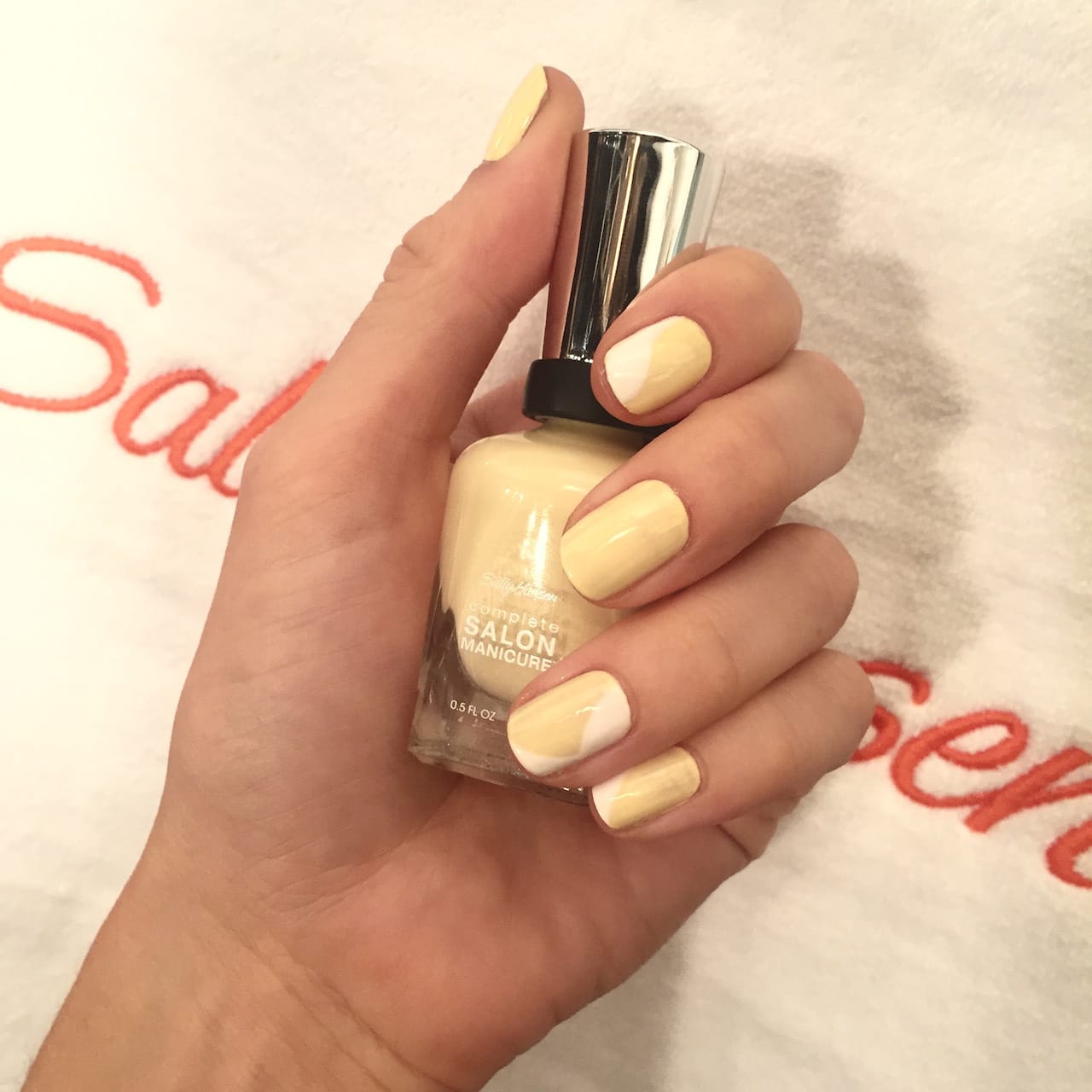 Der Look besteht aus zwei Schichten Complete Salon Manicure Nagellack in der Farbe „Mom’s the Word“ (ca. 9 €). Den Base Coat kann man sich hier sparen, da in den Complete Salon Manicure Lacken ein Unterlack quasi integriert ist. Das ist super praktisch, da mir das bei über 40 Models so einige Schichten Lack und jede Menge Zeit spart. Wenn die zwei Schichten gut getrocknet sind, setze ich mit dem Pinsel des weißen Lacks (Farbe Let’s Snow, ebenfalls ca. 9 €) einfach an einer beliebigen Stelle des Nagels an und ziehe eine willkürliche, natürliche und sehr softe Kurve. Auf dem Nagel sollen keine scharfen Kanten oder Ecken vorhanden sein. Danach habe ich eine Schicht Insta-Dry Anti Chip Top Coat (ca. 8 €) aufgetragen, um den gelben und weißen Lack miteinander zu „verschmelzen“. Die Nägel an den Füßen habe ich in eine natürliche, hellrosa Farbe gehüllt – ganz ohne Nailart.