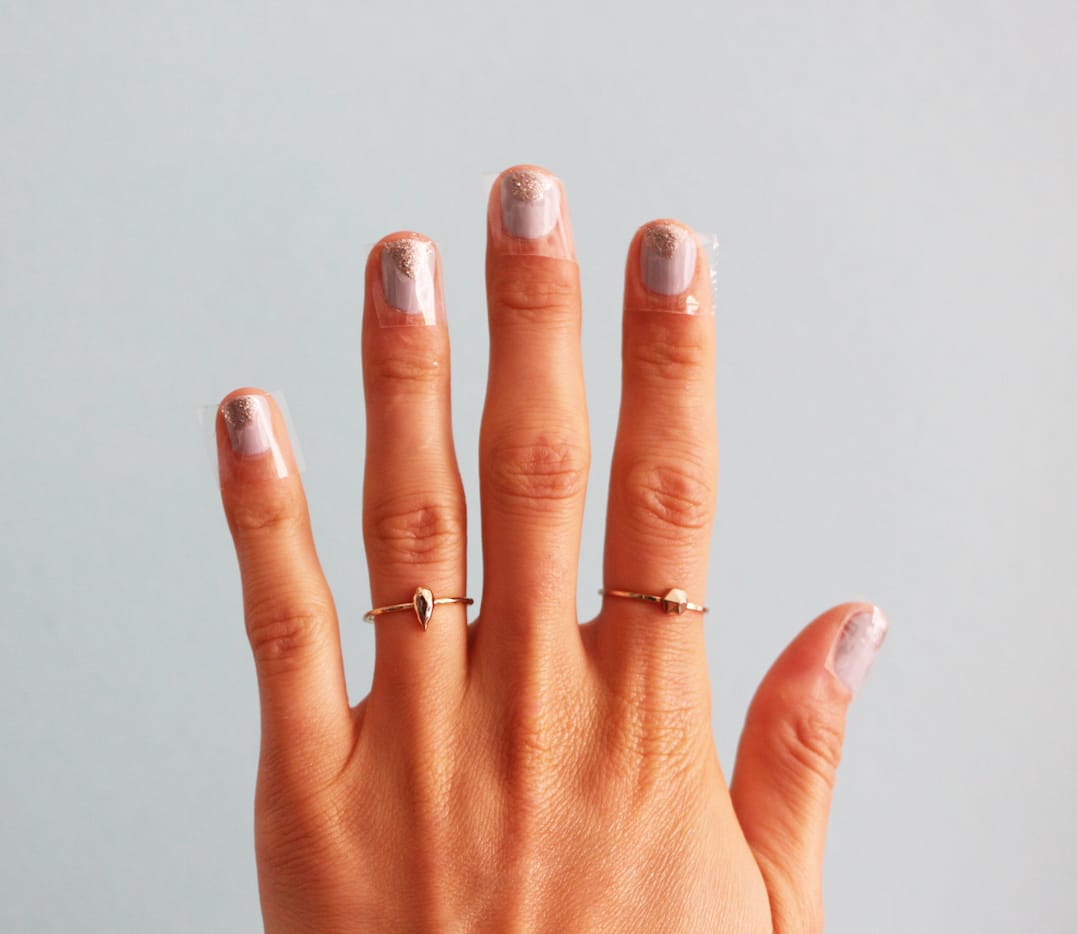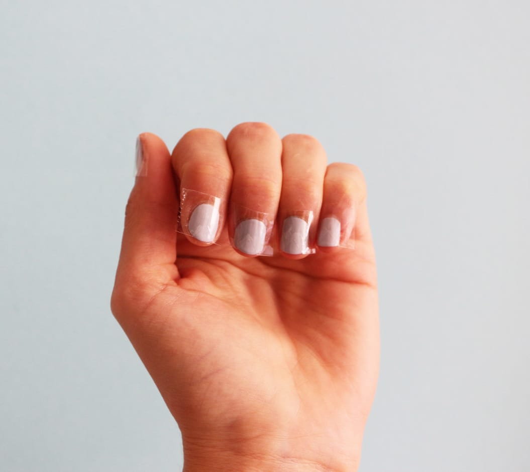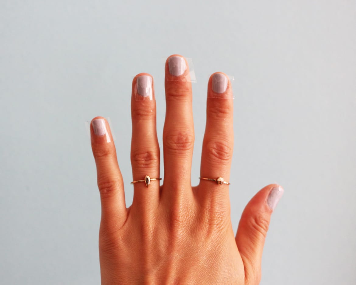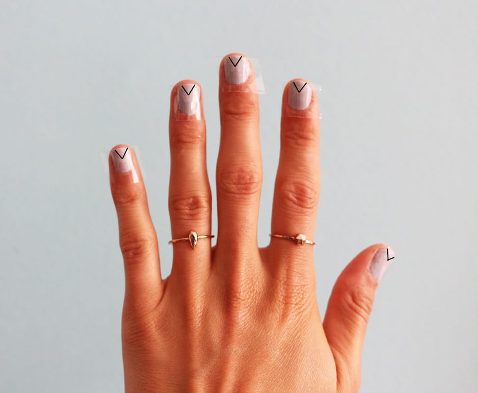#5 Beim Lackieren gibt es jetzt nur zwei Dinge zu beachten: nicht zu viel Lack auftragen und immer vom Nagel weg lackieren, also zur Nagelspitze hin. So minimierst du die Gefahr, dass Lack unter den Tesa läuft. Nach mehreren Tests lautet die oberste Regel: so wenig Lack wie möglich verwenden, sonst wird das Dreieck wulstig und löst sich schnell ab.