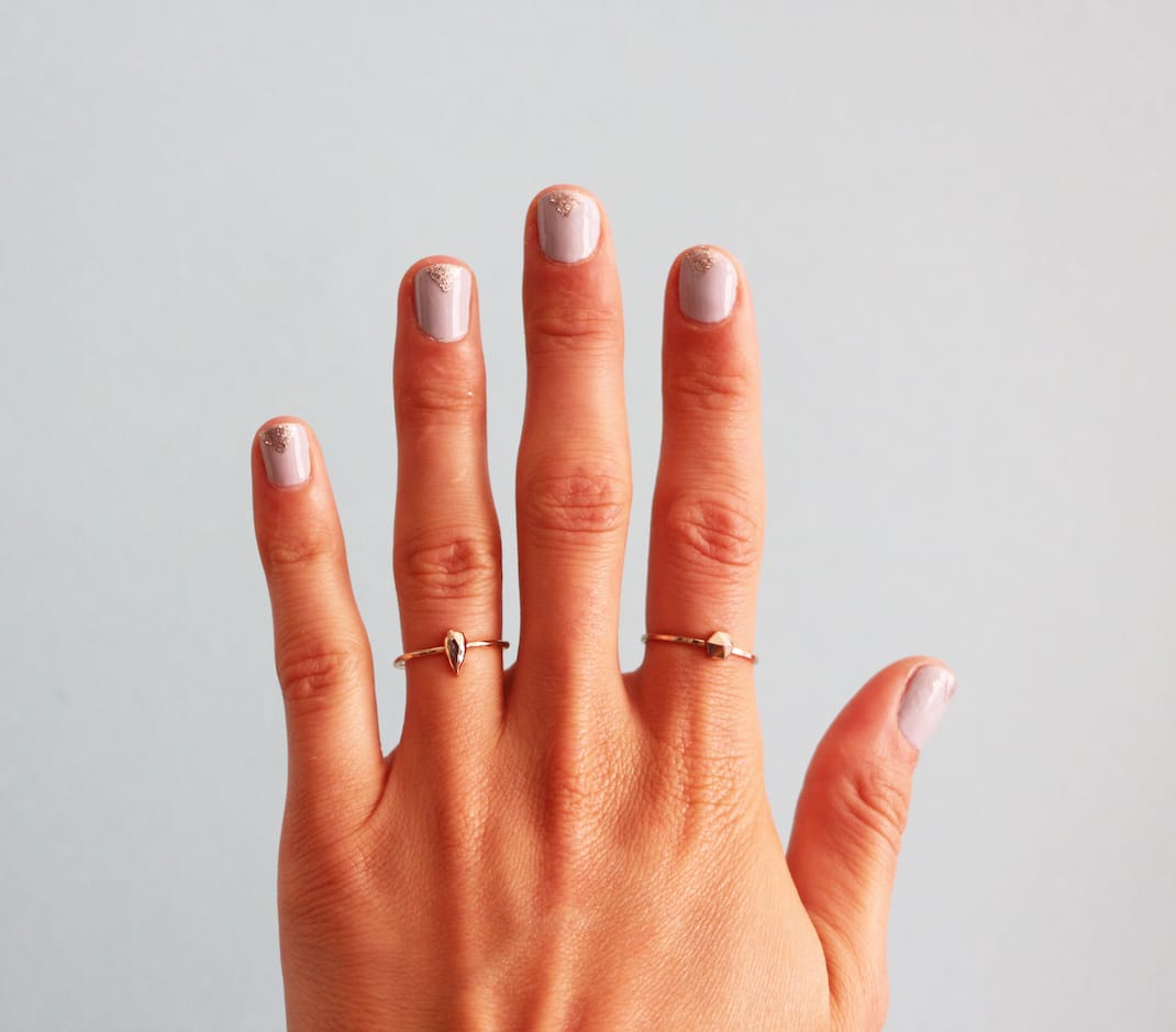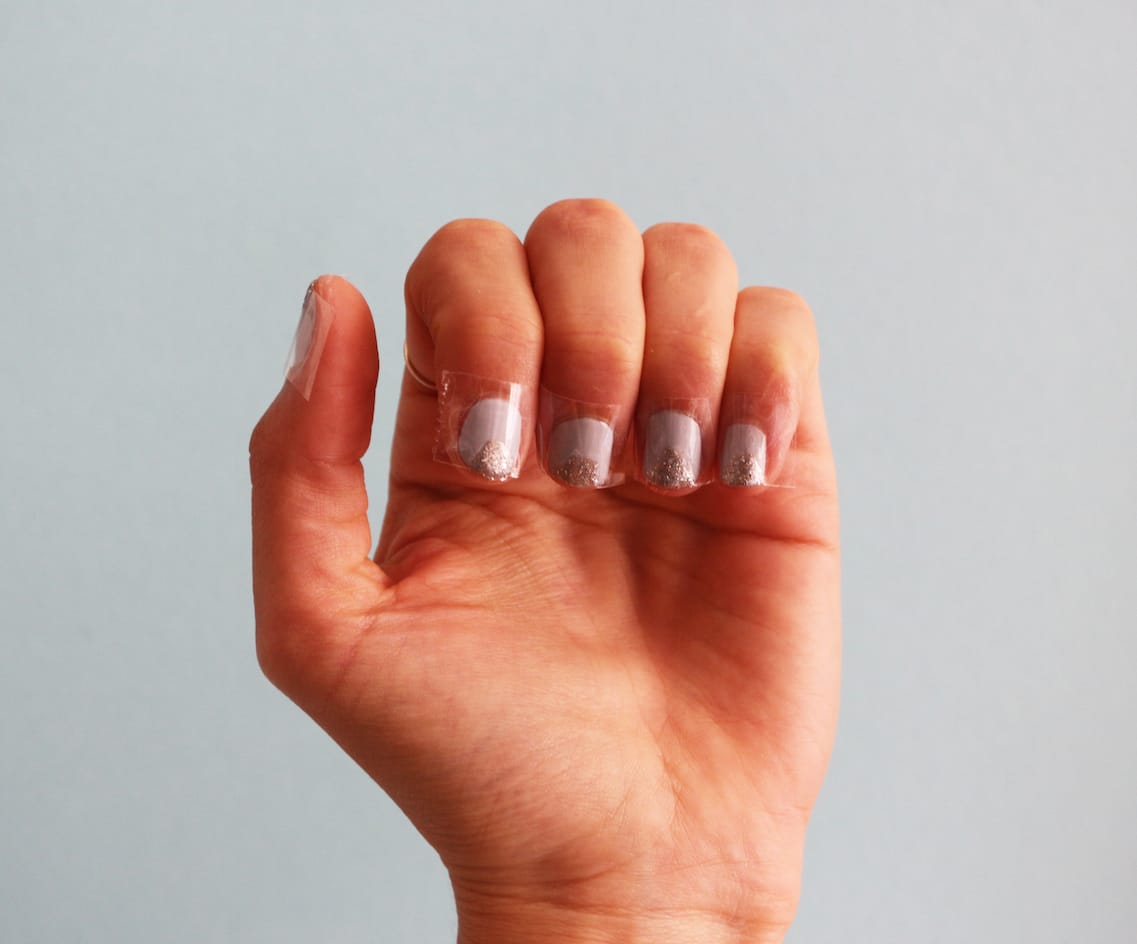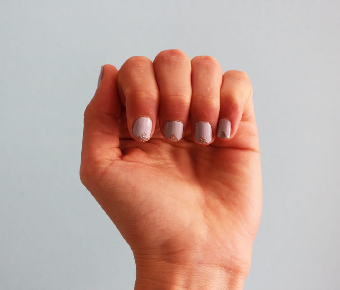 #5 Beim Lackieren gibt es jetzt nur zwei Dinge zu beachten: nicht zu viel Lack auftragen und immer vom Nagel weg lackieren, also zur Nagelspitze hin. So minimierst du die Gefahr, dass Lack unter den Tesa läuft. Nach mehreren Tests lautet die oberste Regel: so wenig Lack wie möglich verwenden, sonst wird das Dreieck wulstig und löst sich schnell ab.