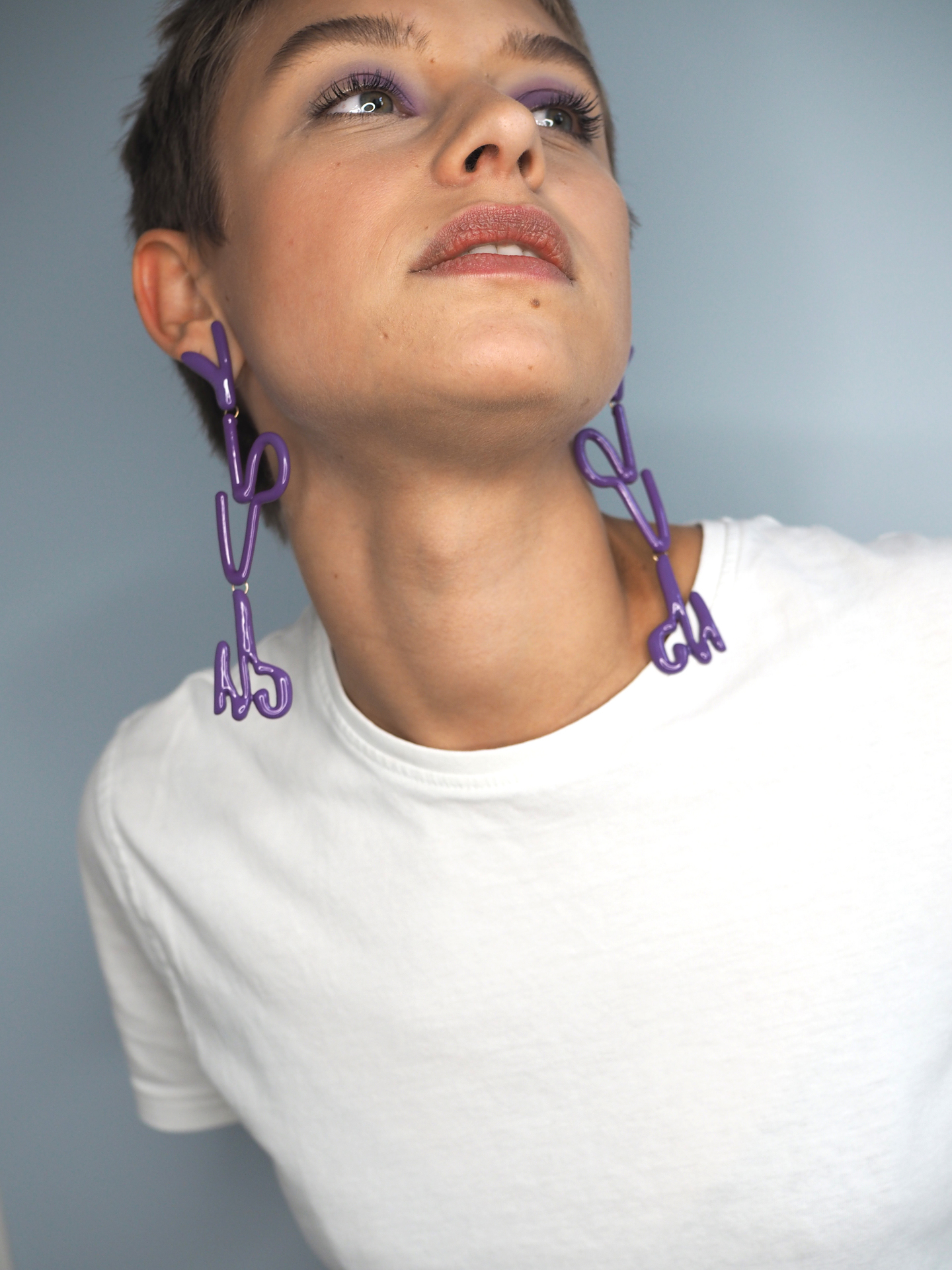 Es geht in die zweite Runde unserer matching Looks. Ein neuer Tag, ein neuer Style und heute möglicherweise auch eine kleine Herausforderung, die euch aber – wie versprochen – nicht mehr als fünf Minuten kostet. Heute habe ich mir die Farbe Lila vorgeknöpft. Um ehrlich zu sein, war ich noch nie ein großer Fan des violetten Spektrums. Vielleicht weil meine Mama immer gesagt hat, dass Lila die Farbe der frustrierten Hausfrauen ist. Ehrlich, wie kommt sie auf so einen Quatsch? Jedenfalls finde ich Lila auch nicht besonders kleidsam, Purple Rain doof und den gleichnamigen Film super traurig. Das hat bisher auch die Tatsache nicht ändern können, dass mir die Kosmetikindustrie zu meinen grünen Augen die Konträrfrabe seit Jahr und Tag als perfektes Match verkaufen will. Doch dann habe ich vor ein paar Tagen diese Ohrringe gespottet und mich schockverliebt. Also habe ich beschlossen der Schnittstelle aus Blau und Rot eine Chance zu geben. Und ja, was soll ich sagen, ich finde es erstaunlich cool. Was ich mir bei dem heutigen Look genau gedacht und wie ich ihn geschminkt habe, erkläre ich euch jetzt sofort.