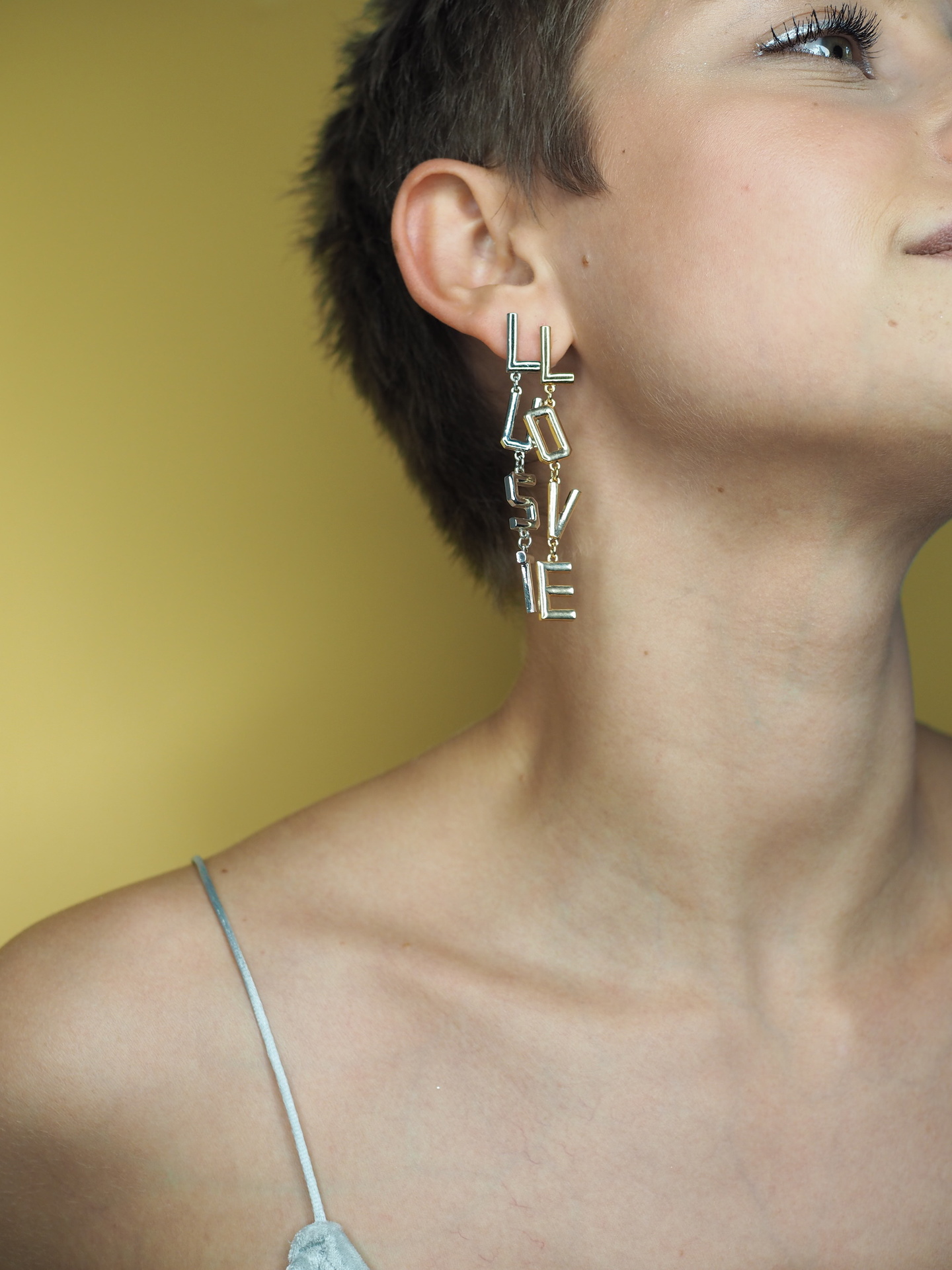 Lust und Love – ich habe mich magisch zu diesen Ohrringen hingezogen gefühlt, wie ihr euch vielleicht denken könnt. Entdeckt habe ich sie auf Asos, wo die kleinen Bad Boys 7 Euro kosten und hier bekommt ihr sie. Ich habe mich dazu entschieden sie ganz plakativ auf einer Seite zu tragen. Dazu habe ich noch ein silbernes Samt-Shirt aus der Schublade gepult. So habe ich das letzte der monochromen Looks komplettiert.