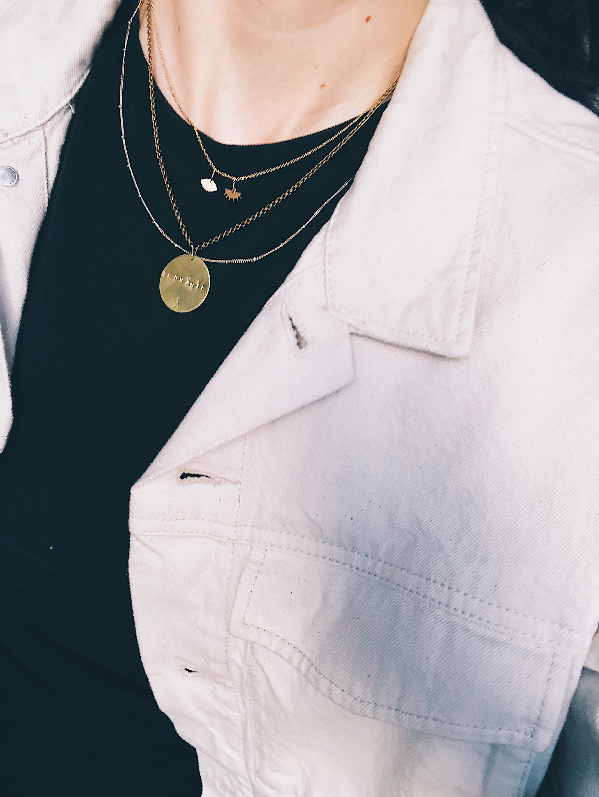 Die kleinere Kette mit dem offenen und geschlossenen Auge ist nicht von Chiara Ferragni (nein, nein!), sondern von Tassia Canellis! Ihr Atelier sitzt ebenfalls in Paris und ich liebe diese Kette gerade deshalb so sehr, weil sie so super fragil ist. Ich konnte sie auf ihrer Seite noch in einem ihrer Lookbooks finden (ca. 50 €), bin mir aber nicht sicher, wo und ob ihr sie noch kaufen könnt. Ich überlege viel mehr, wie ich noch an die passenden Hoops komme! Vielleicht einfach über Insta anschreiben? Einen Versuch ist es mit Sicherheit wert!