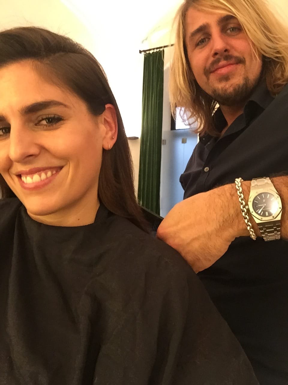 Nach dem Haare waschen darf ich auf einem der schwarzen Stühle bei Niko Platz nehmen. Meine Ansage: Blond, kaputte Spitzen, bitte ab, aber nur so viel wie nötig, da ich sie gerne wachsen lassen möchte. Seine Ansage: machen wir. Gut, die Kommunikation stimmt schon mal. Wenn ich nämlich eines gar nicht haben kann, sind freche Frisurenvorschläge von Friseuren, die offensichtlich einen völlig anderen Geschmack haben als ich. Viel zu oft habe ich den Vorschlag „einen kessen Stufenschnitt“ oder „nur so ein bisschen Pony“ schon gehört. Da fall ich nicht mehr drauf rein und verlasse dann unzufrieden und mit 00er-Jahre-Stufencut den Salon. Nein, das mach ich nicht mehr. Aber darüber muss ich mir hier auch keine Sorgen machen. Niko hat ne blonde Surfermatte, ist ein Ur-Münchner und so gut informiert, dass ich eigentlich nichts sagen muss. Er hat verstanden, dass ich nicht der Typ bin, der jeden Morgen die Haare über die Rundbürste föhnt und mit Haarspray fixiert, sodass tagsüber auch ja kein Härchen seinen Platz verlässt. Der Schnitt muss am Ende ohne Styling auskommen und die herauswachsenden Fransen müssen hinters Ohr passen. Und was soll ich sagen: genau so ist es geworden.